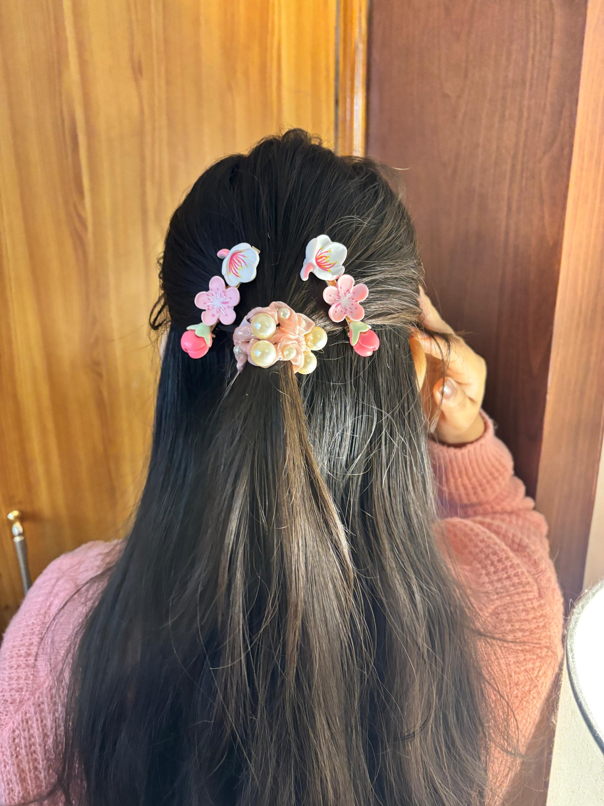 - Pink flower hair clips (pair) โ Translucent pink floral hair accessories with a soft glossy finish.