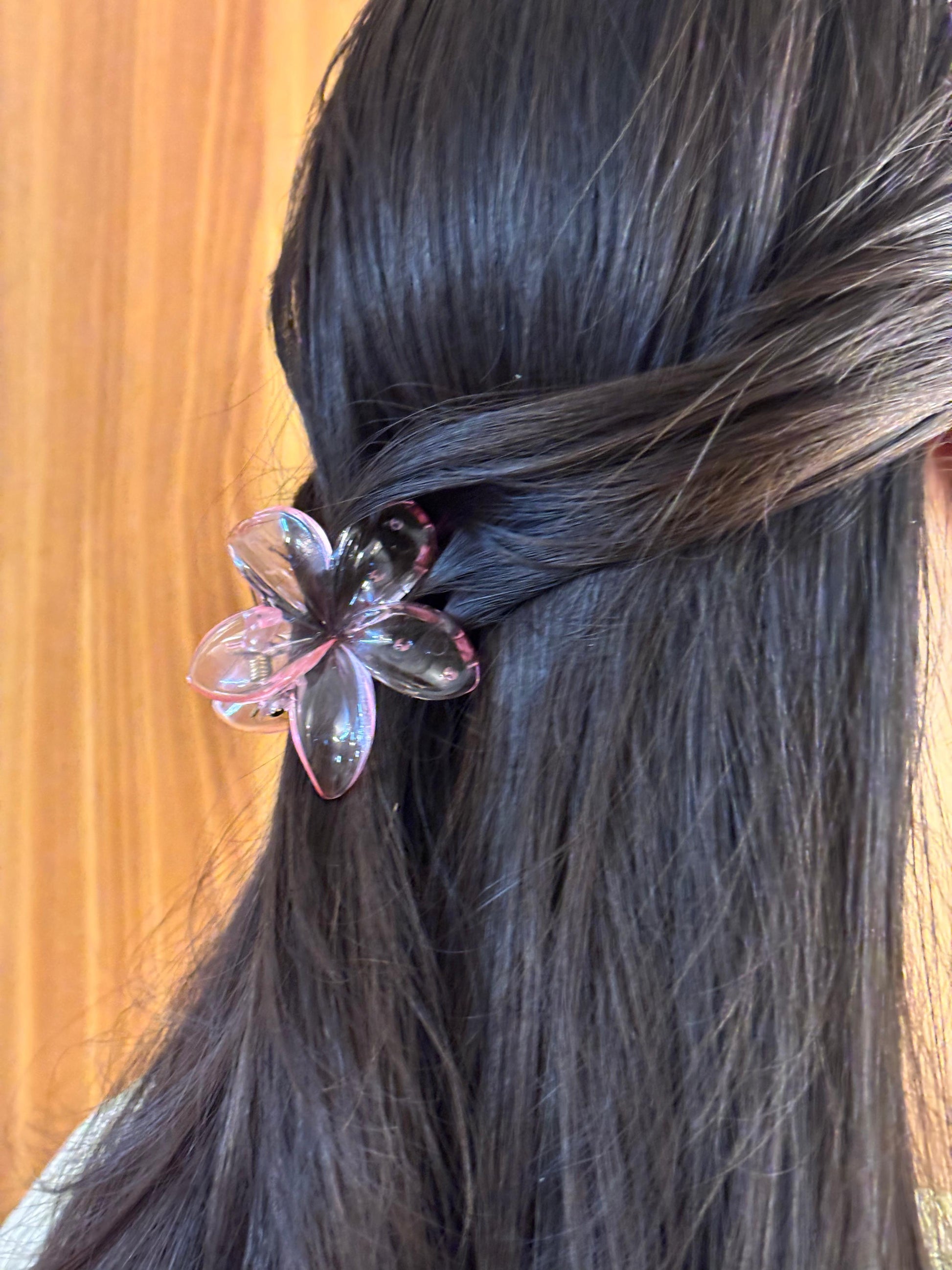 - Pink translucent flower hair clip โ Large floral-shaped claw clip with a soft translucent finish.