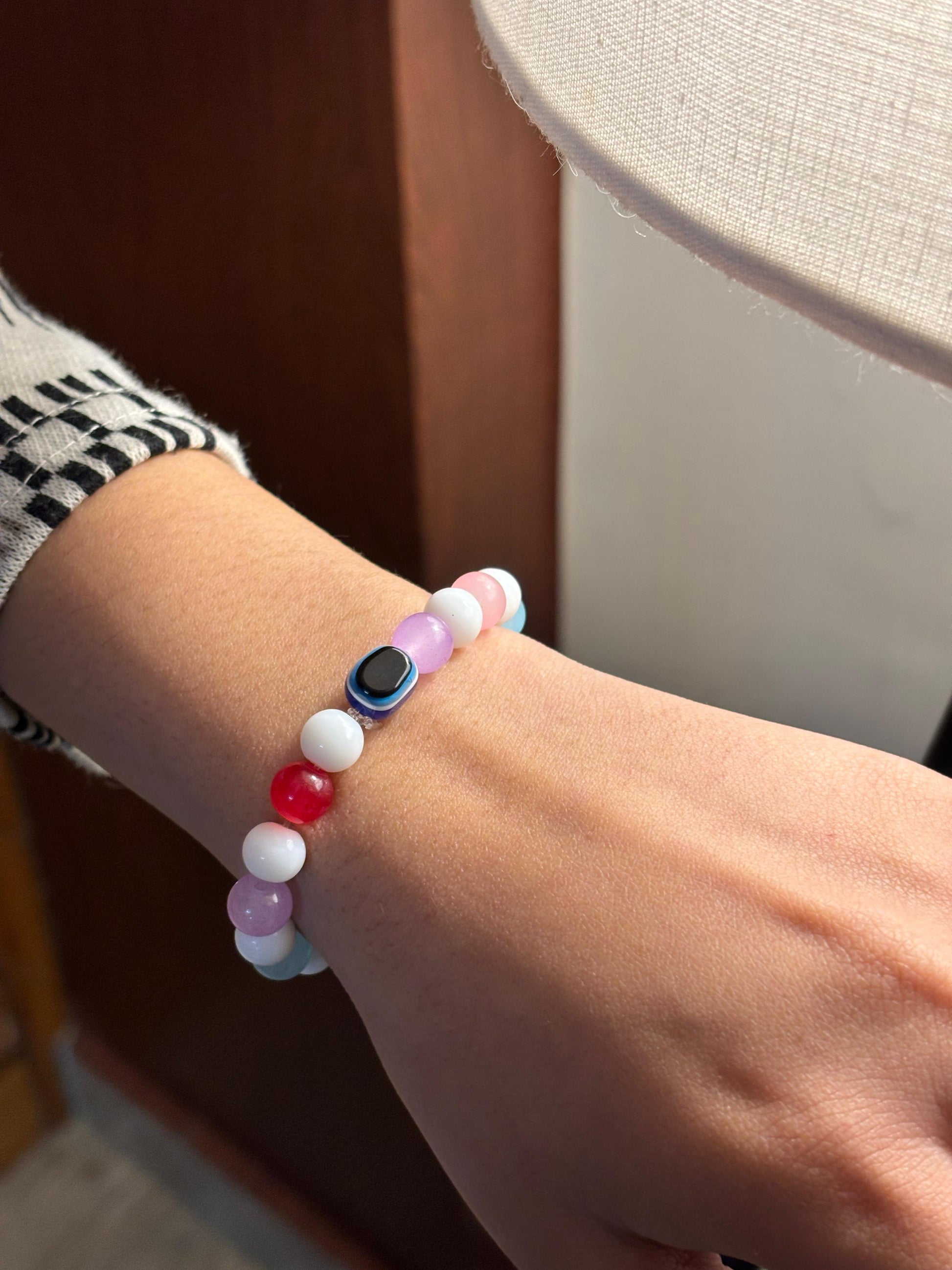 - Pastel multicolour evil eye bracelet โ Elastic bracelet with soft pastel beads and a central evil eye charm.