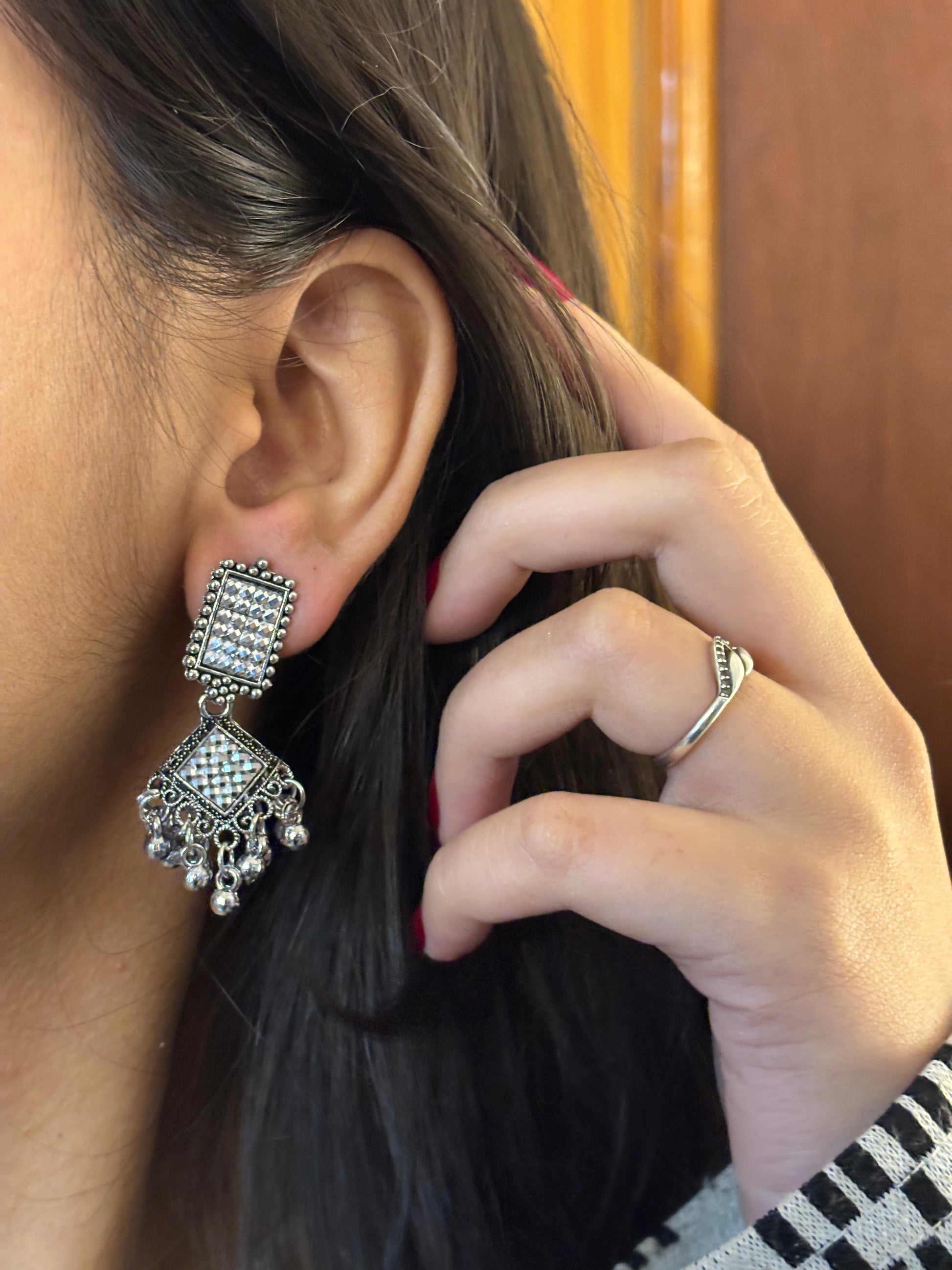 - Silver square jhumka earrings โ Square crystal stud paired with an engraved square plate and hanging bead detailing.