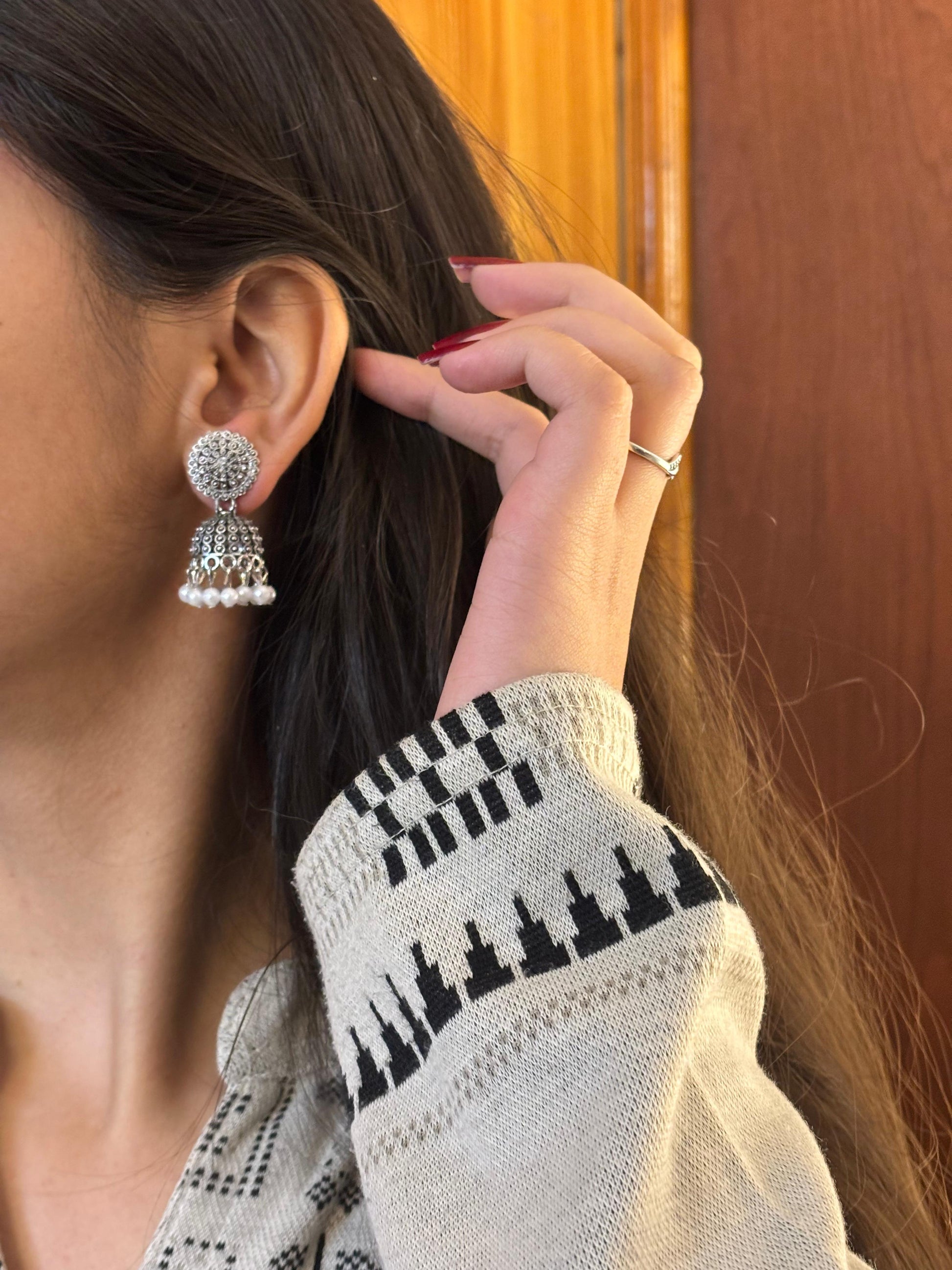 - Silver round kundan jhumka earrings โ Circular kundan-style stud with a detailed dome jhumka and pearl drops.