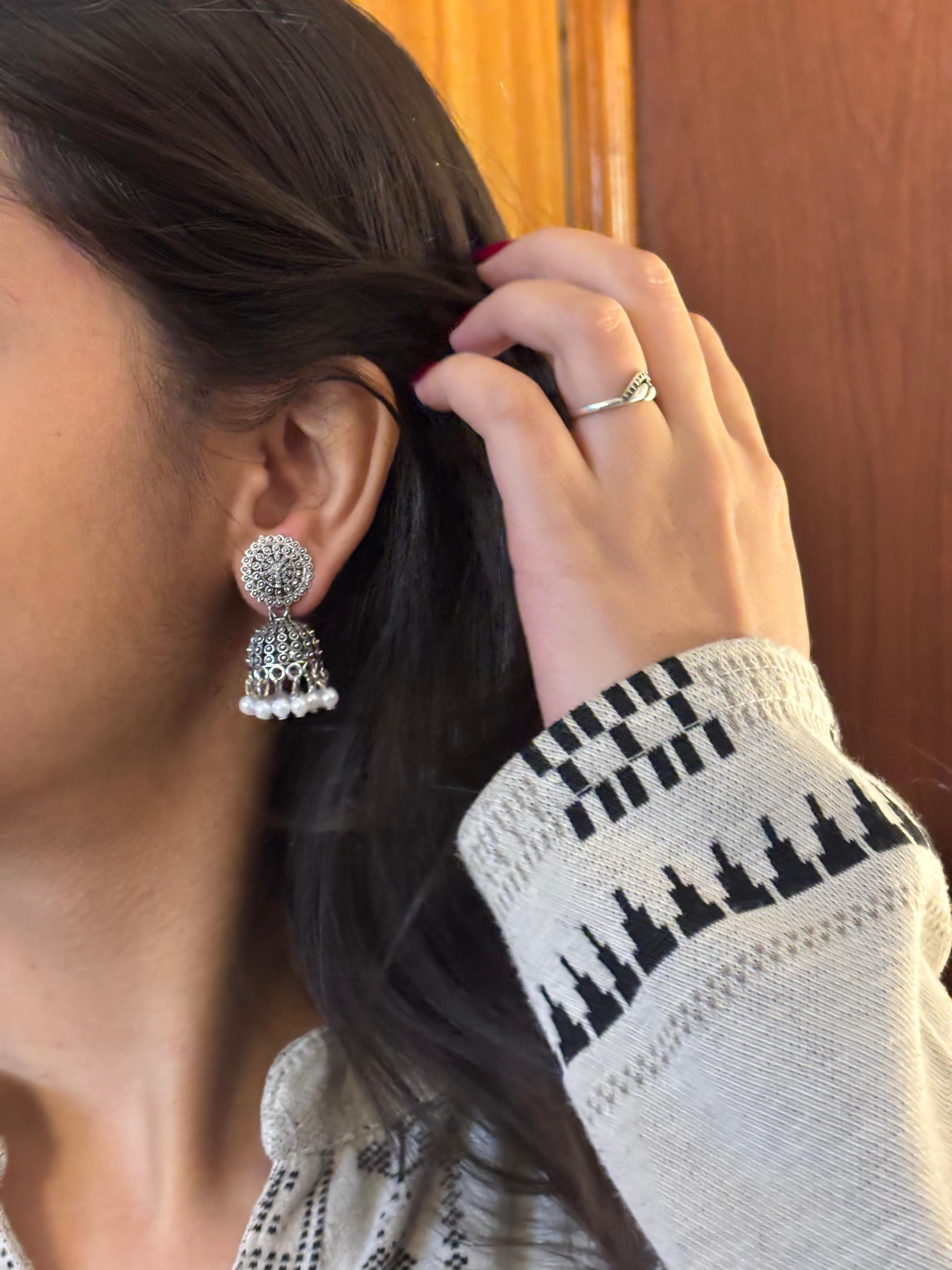 - Oxidised floral jhumka earrings โ Flower-shaped stone stud complemented by intricate dome jhumka detailing.