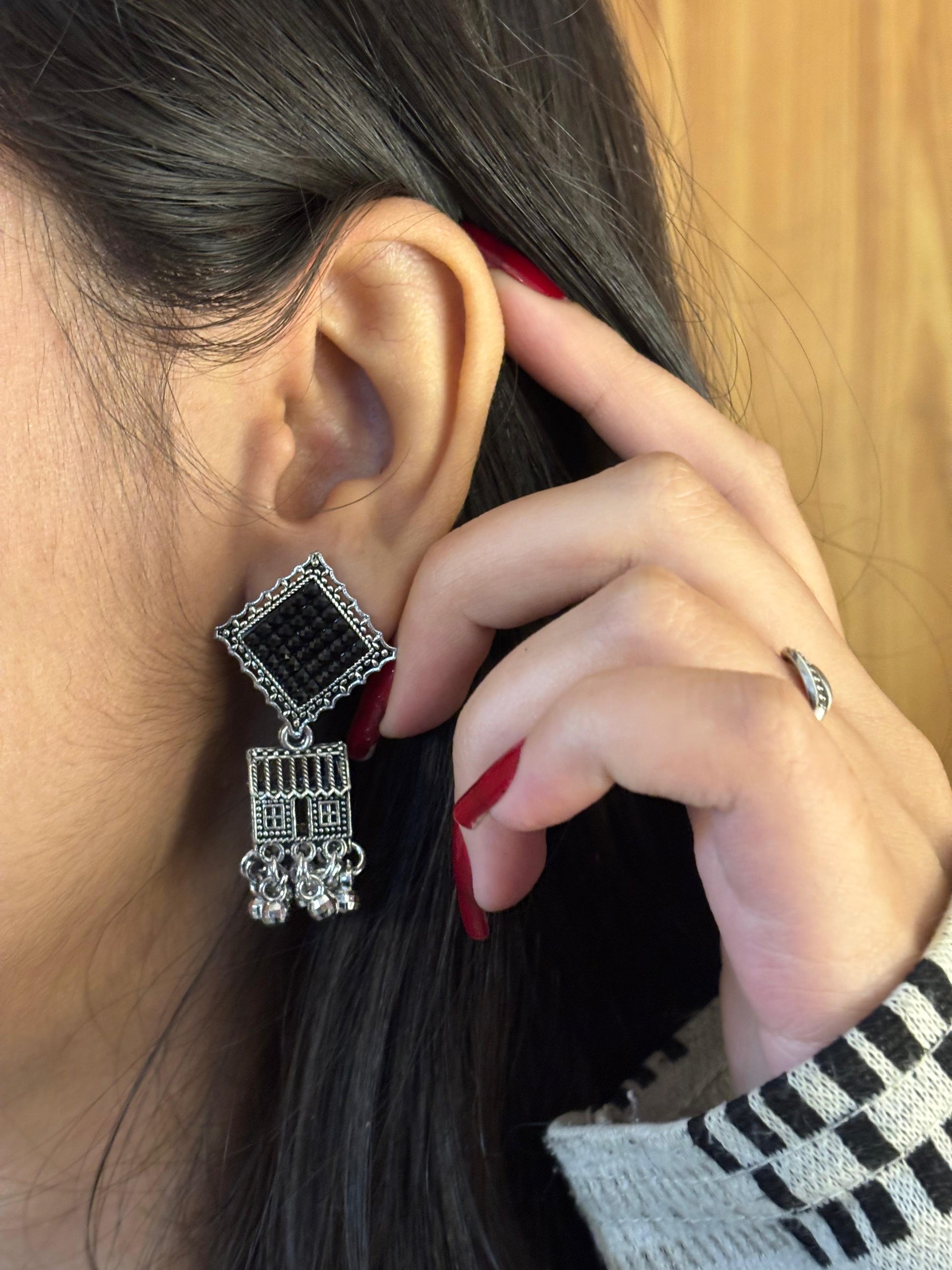 - Black square jhumka earrings โ Square stud top embellished with black stones and dangling ghungroo-style beads.