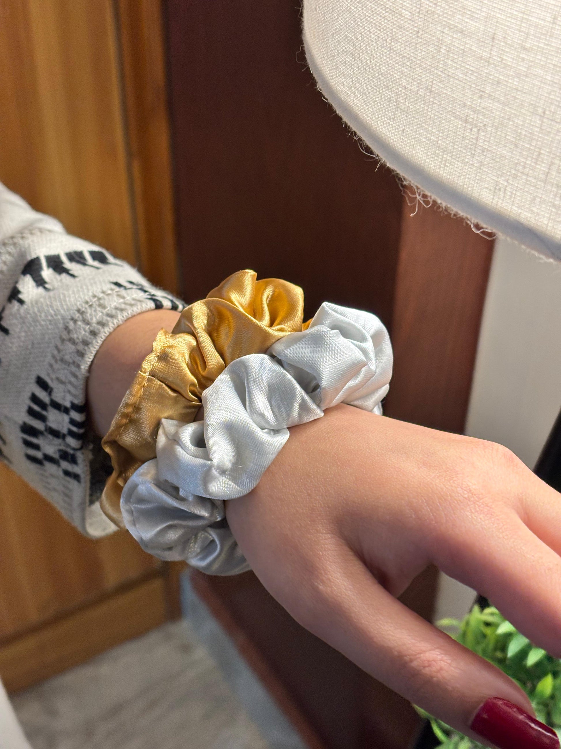 - Pink pearl scrunchie โ Satin scrunchie with pearl embellishments.
