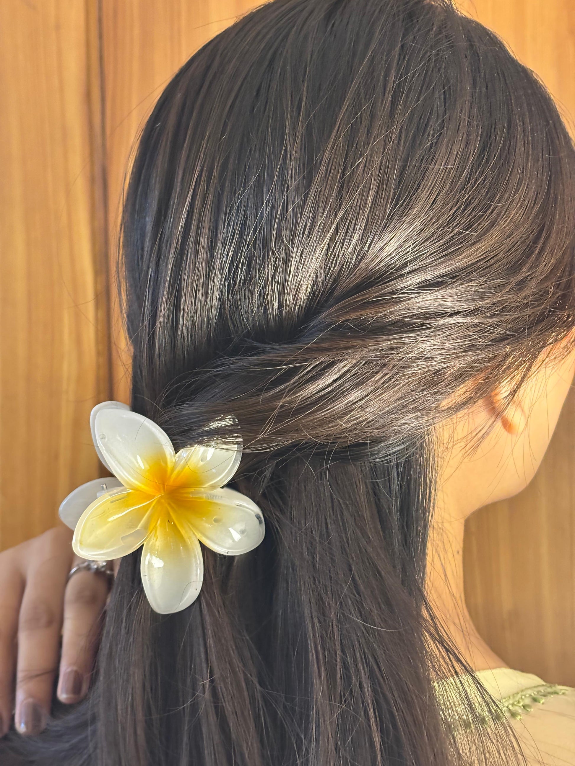- White-yellow translucent flower hair clip โ Dual-tone floral hair accessory.