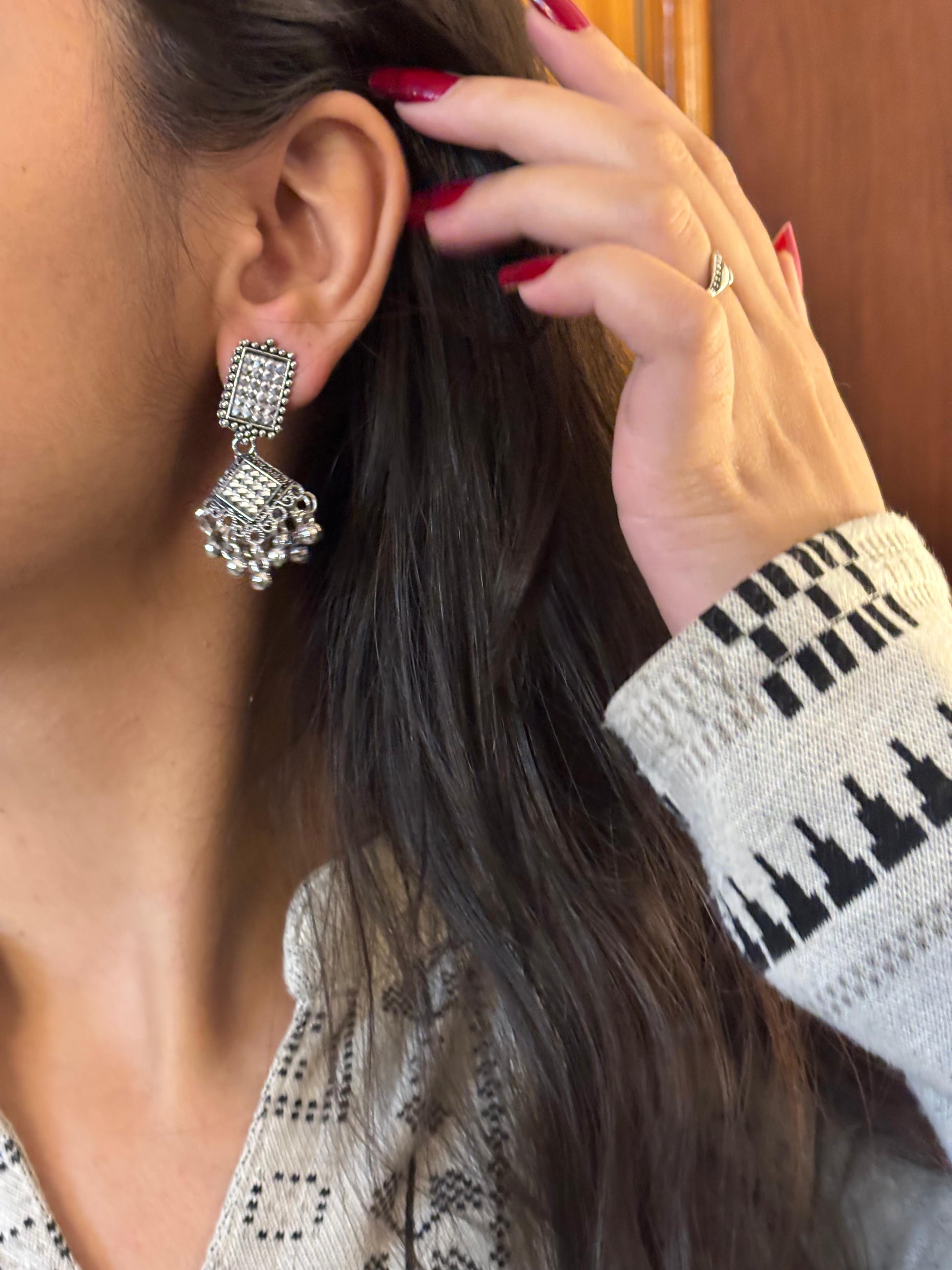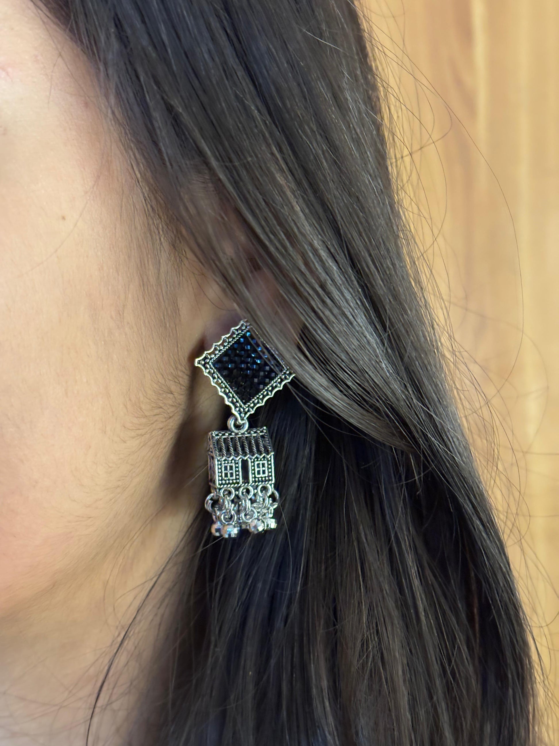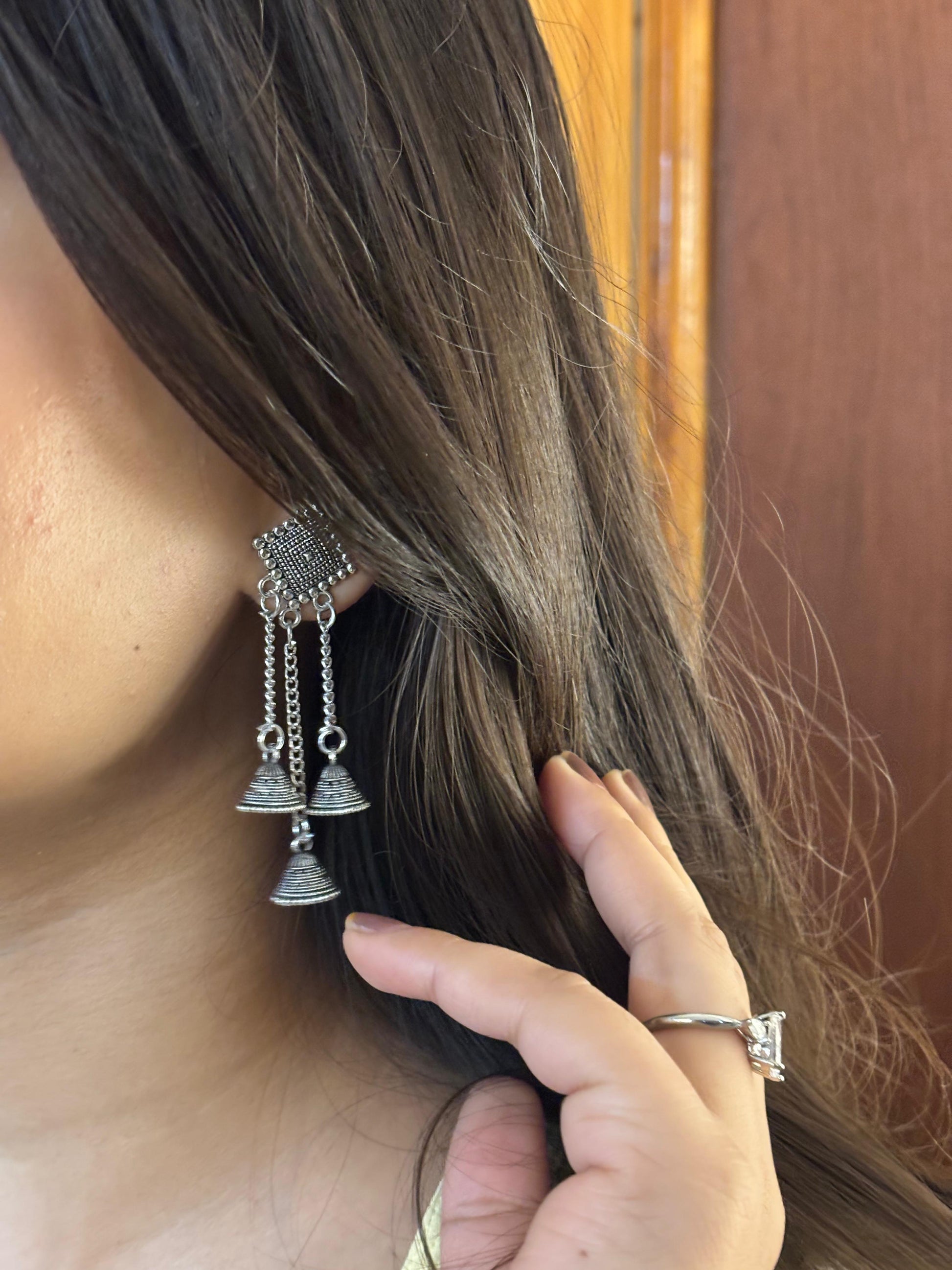 - Oxidised square jhumka earrings โ Square engraved stud with layered dangling beads.