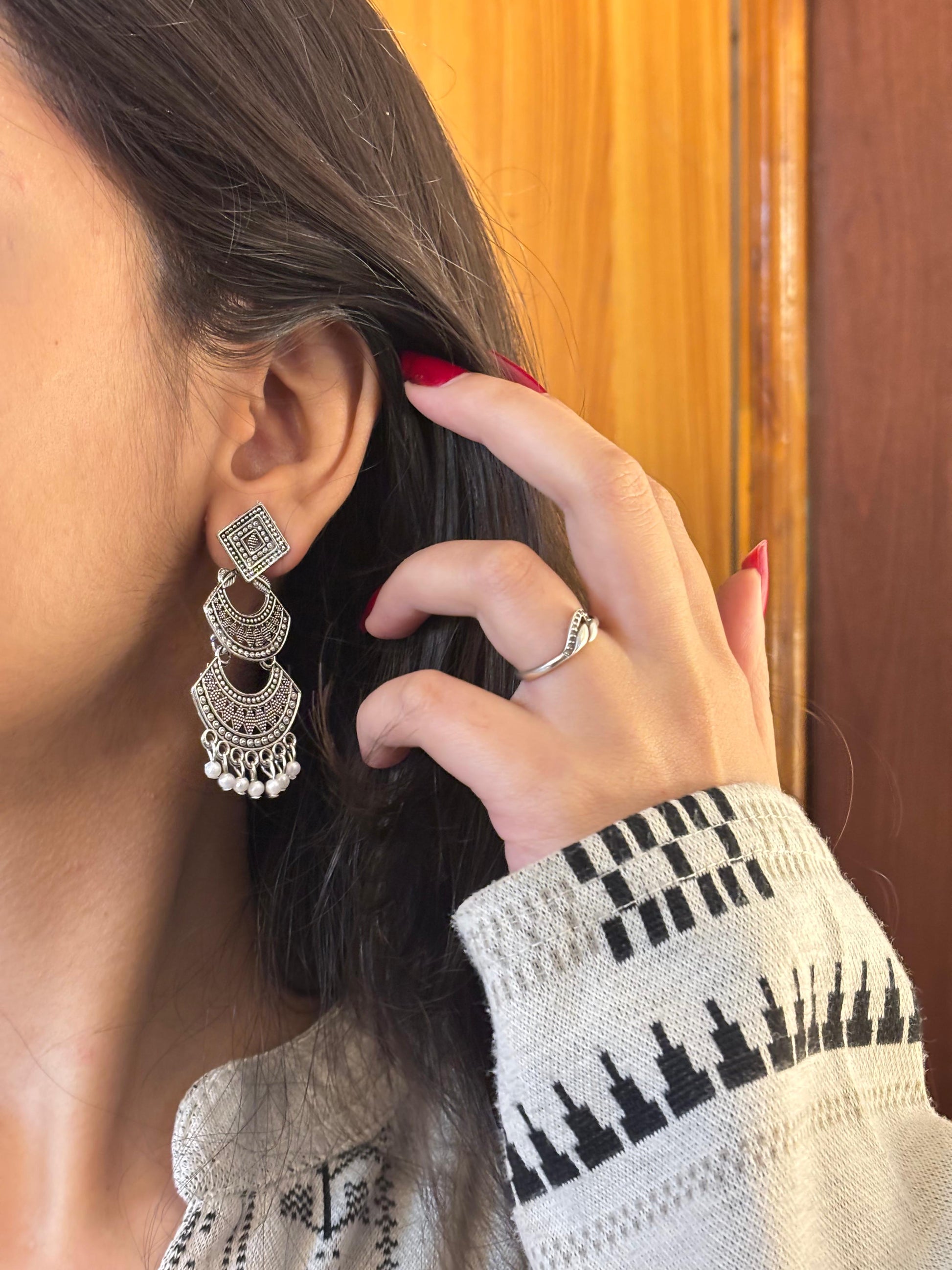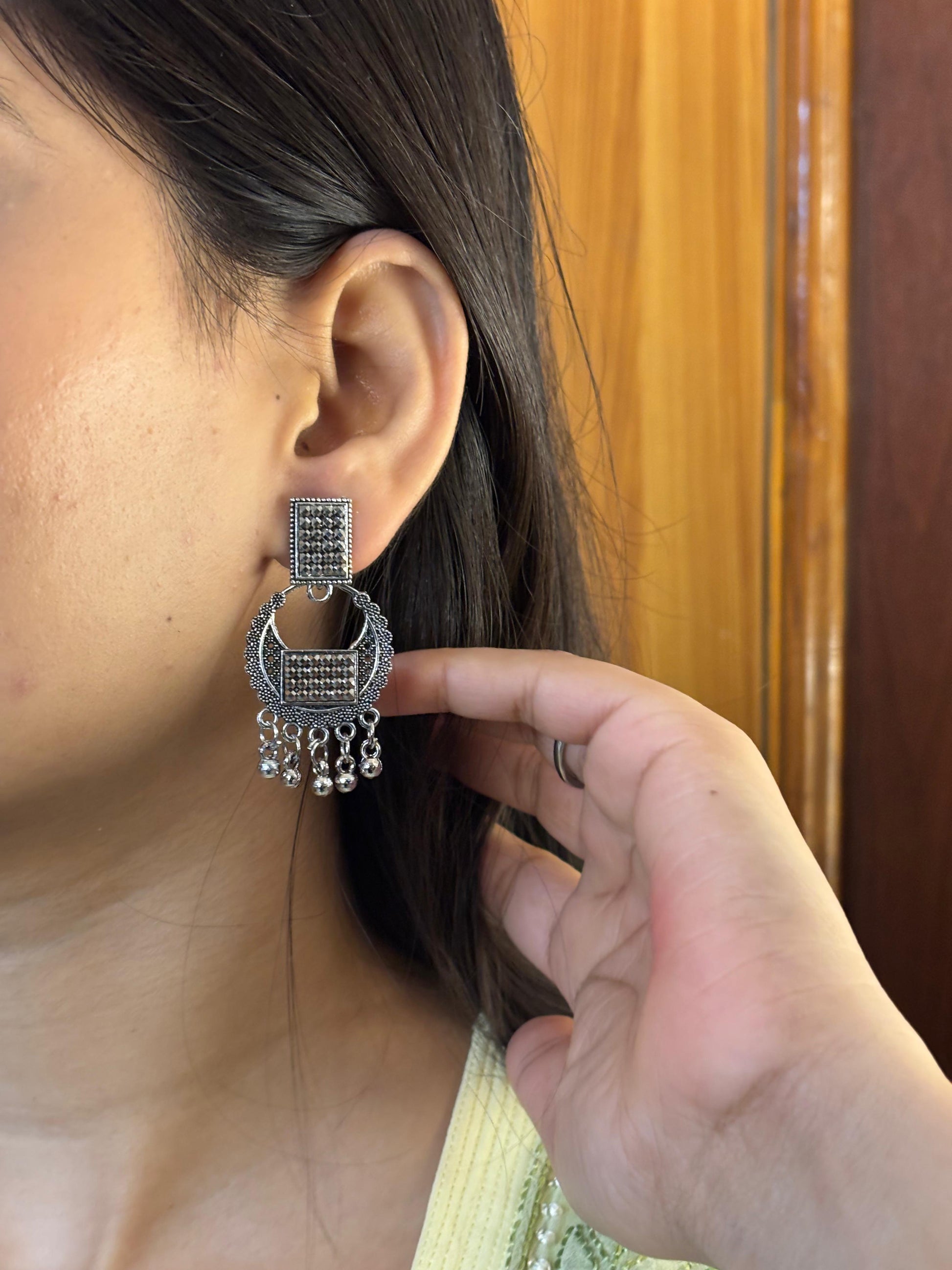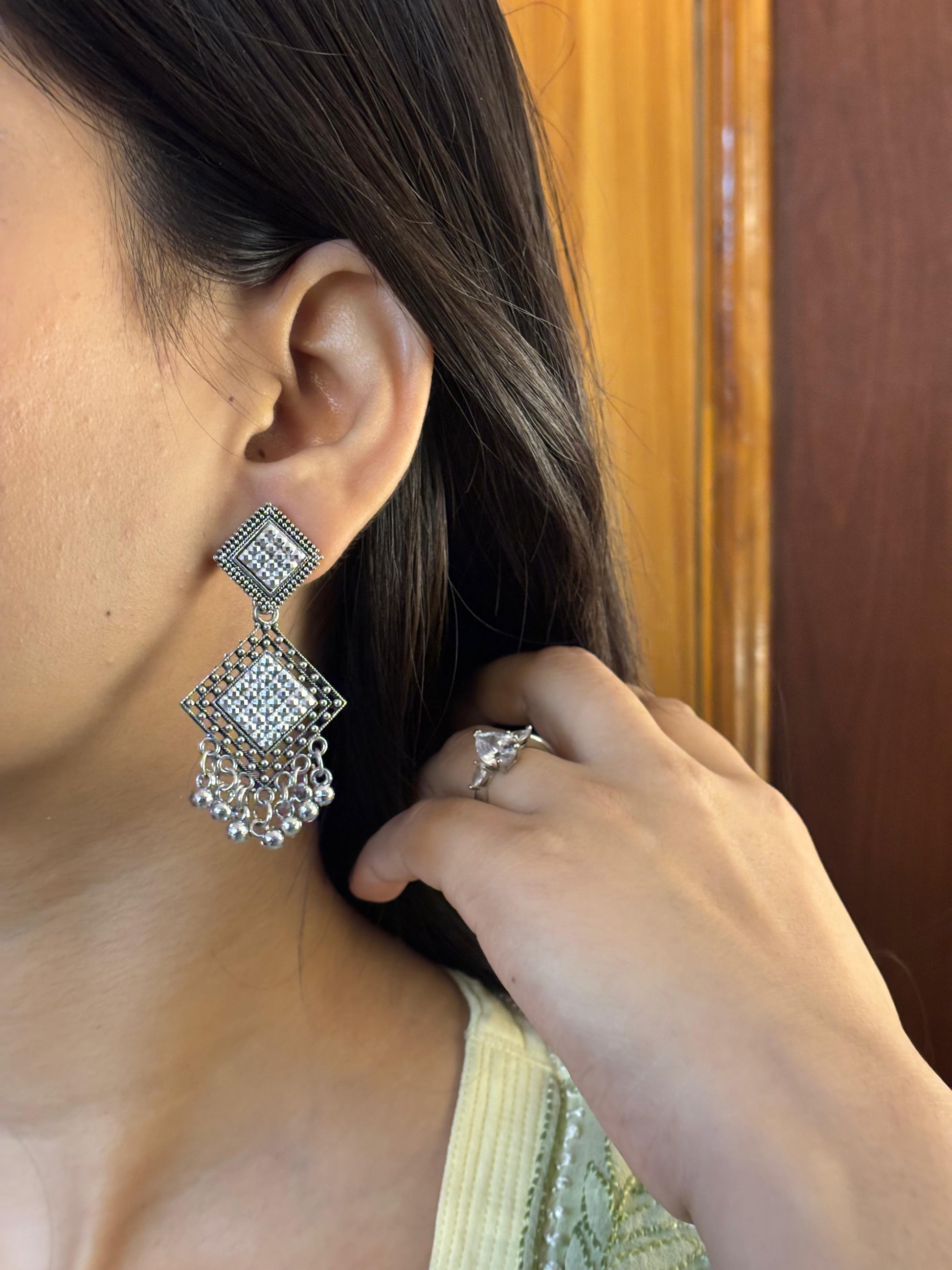 - Oxidised square jhumka earrings โ Square engraved stud with layered dangling beads.