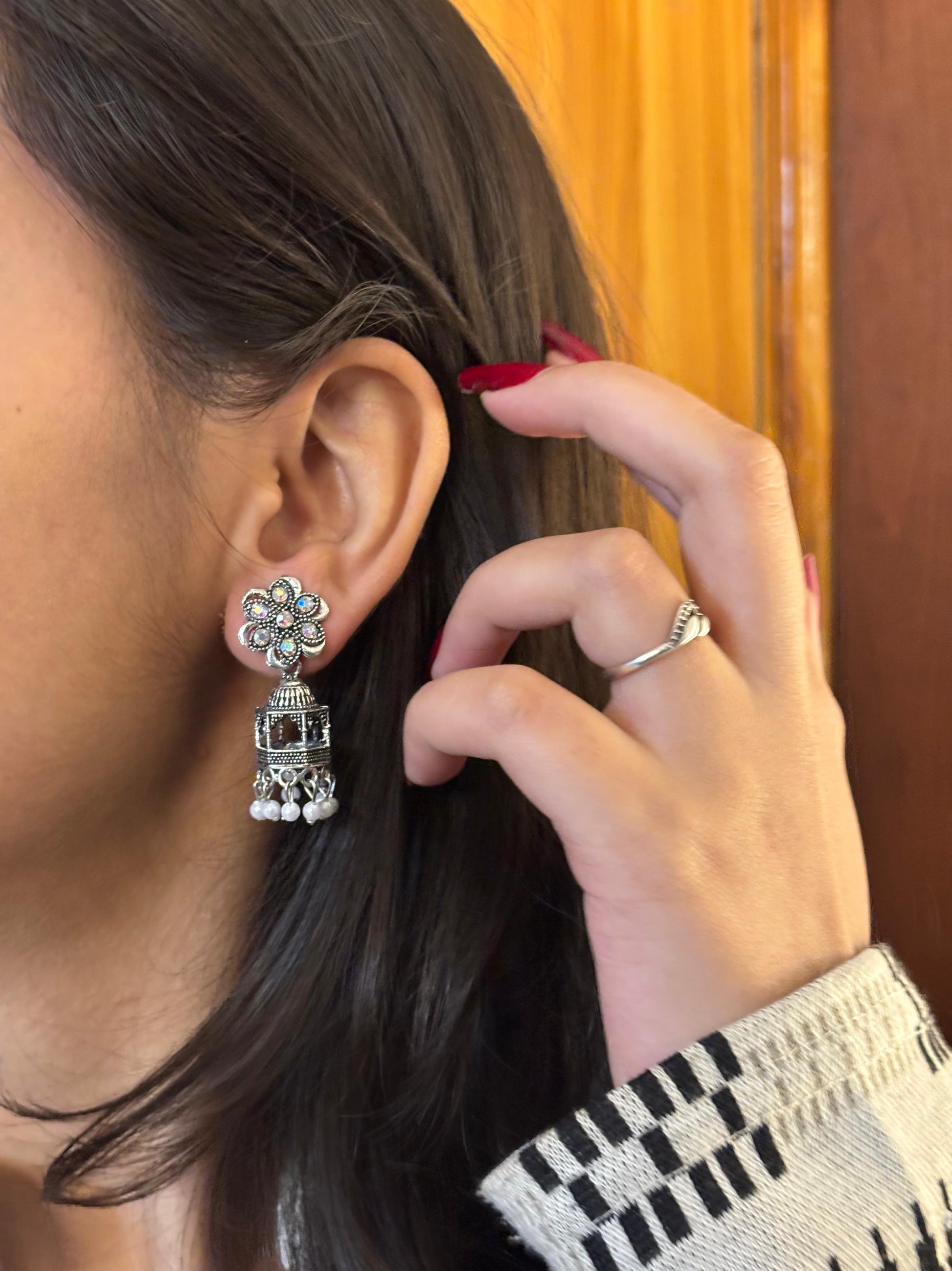 - Oxidised floral jhumka earrings โ Flower-shaped stone stud with dome jhumka detailing.