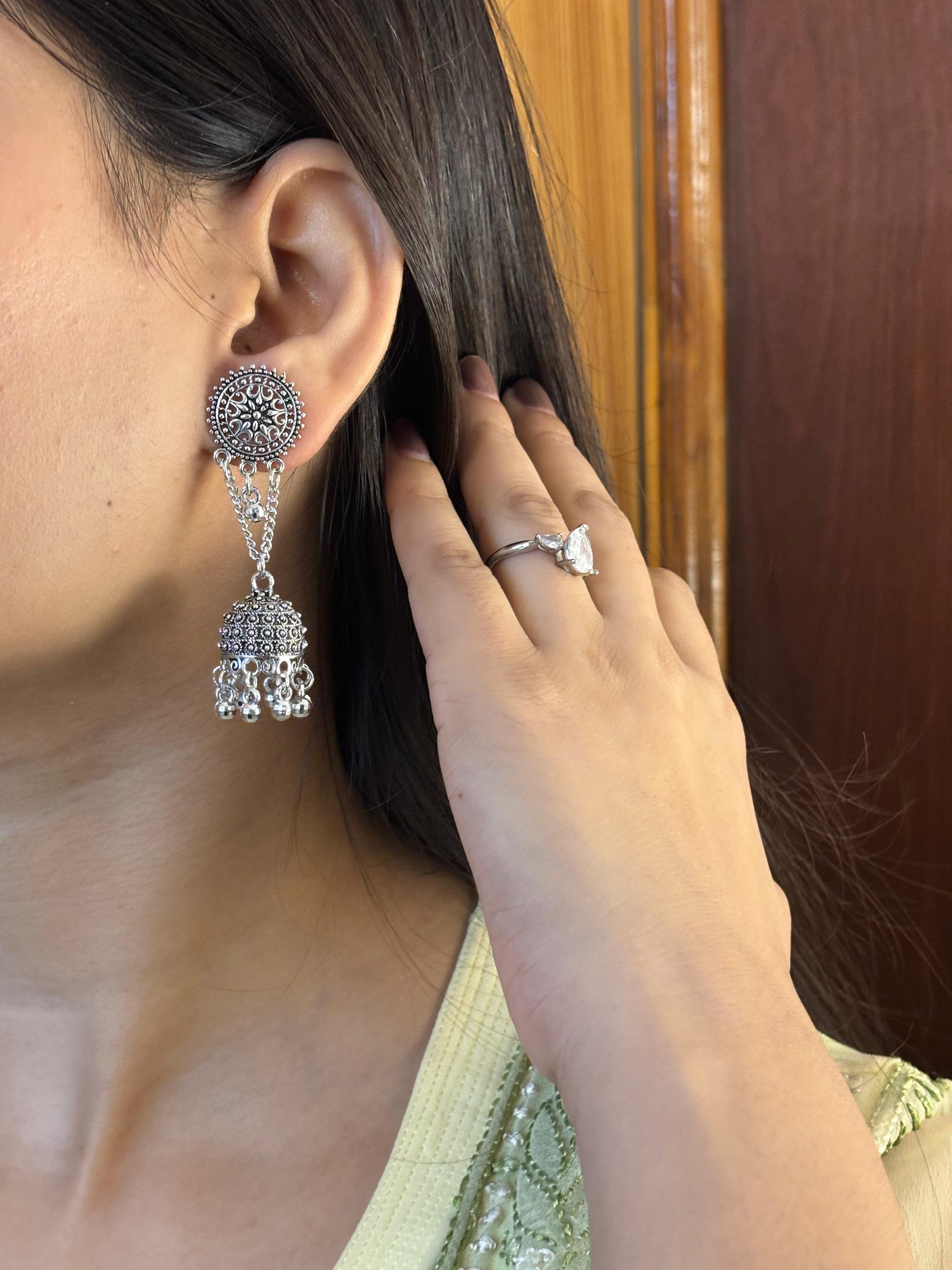- Silver square & chain jhumka earrings โ Square stone stud with chain-linked mini jhumkas.