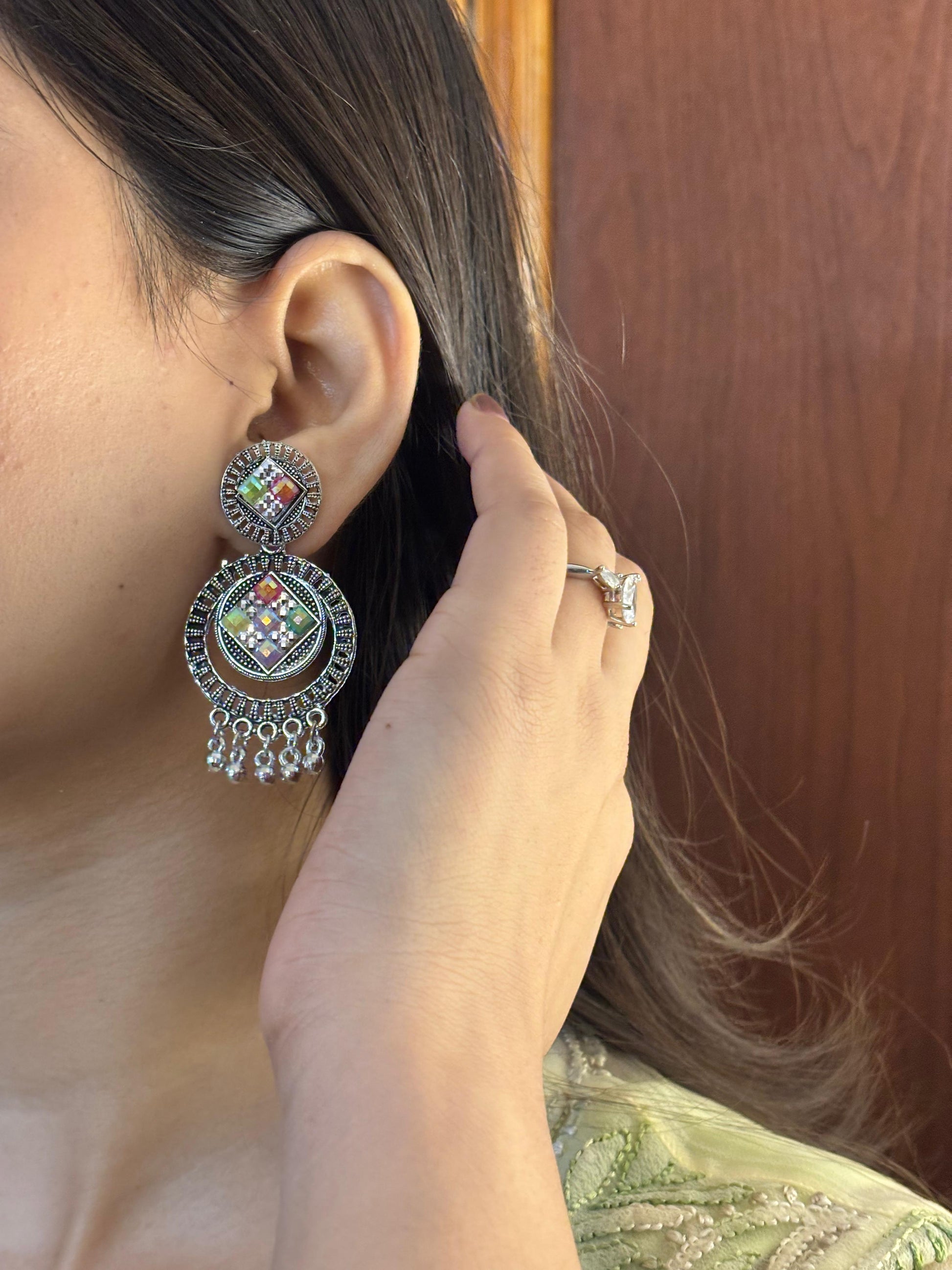 - Multicolour oxidised jhumka earrings โ Circular stud with colourful stones and jhumka drops.